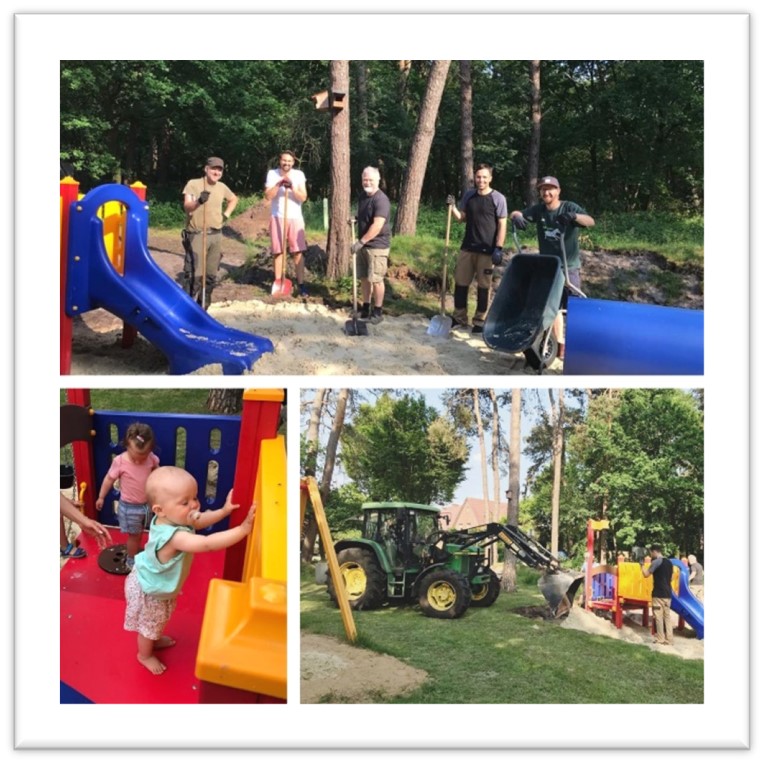 Bei diesem Arbeitseinsatz wurde der Wunsch nach einem Kleinkinderspielgerät geäußert. In Rekordzeit ging es nun an dessen Verwirklichung. Eine Crowdfunding-Aktion bei der Volksbank Münsterland Nord wurde ins Leben gerufen (siehe hier). Nach nicht einmal 30 Tagen war der gewünschte Betrag von 2.450 Euro dank der Spendenbereitschaft der Uffelner zusammengekommen. So stand der Bestellung und dem zügigen Aufbau des Spielgerätes nichts mehr im Wege. Der Standort wurde auf dem Spielplatz festgelegt, der geforderte Fallschutzbereich von 28 qm wurde 40 cm tief ausgehoben und das Spielgerät aufgestellt. Die vorhandene Kunststoffröhre wurde mit eingebunden, so dass die Kinder jetzt einen vergrößerten Spielbereich haben. Angrenzend an dem Sandkasten wurde hier eine perfekte Spielecke für Kleinkinder gestaltet. Eine Ausbuchtung aus Sandstein für eine Sitzecke wurde gleich mit eingeplant. Zwei Bänke und ein Tisch sollen demnächst zum Verweilen einladen.