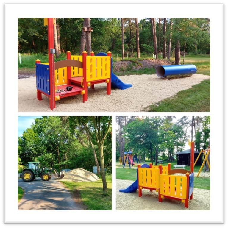 Der IVU veranstaltete eine Anwohnerversammlung auf dem Spielplatz. Die anwesenden Bewohner beschlossen, den Spielplatz zu sanieren. Sie stimmten für eine jährliche Umlage von mindestens 12.- € im Jahr pro Haushalt in der Siedlung. Waldeigentümer Josef Helmer stimmte zu, einige Bäume zu fällen. Dies nahm er dann auch selbst mit der Unterstützung vom „Flüddert“ in die Hand. Die 2012 aufgestellten Geräte waren noch in Ordnung. Aber das alte Schaukelpferd, das Klettergerüst sowie die Rutsche waren nicht mehr normgerecht und mussten entfernt werden. Die restlichen Geräte wurden repariert. Mittels einer Fräse wurden die Baumstümpfe beseitigt. Der Platz wurde etwas verkleinert, planiert und Rasen wurde eingesät. Über 50 Tonnen Fallschutzsand liegen jetzt unter den Spielgeräten und weitere ca. 100 Tonnen Mutterboden und Füllsand wurden als Ausgleich auf dem Waldboden ausgebracht.
