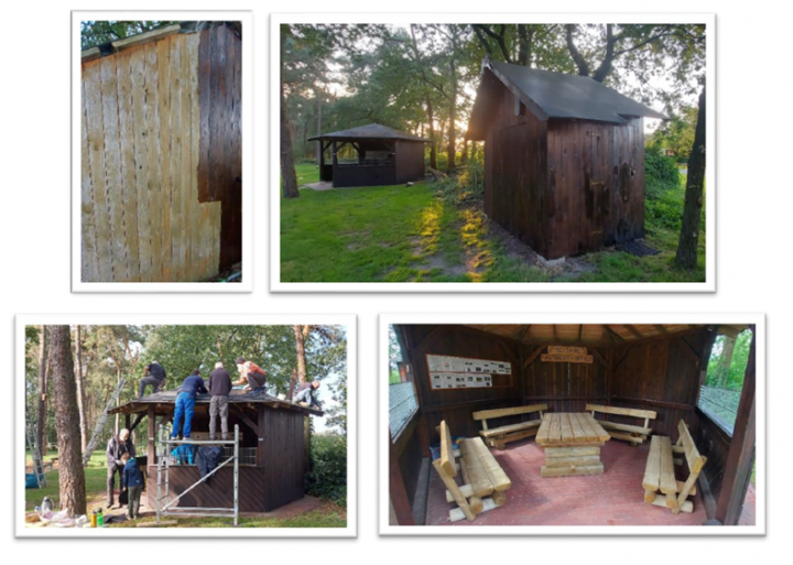 In mehreren Arbeitseinsätzen wurde die Schutzhütte abgeschliffen und neu gestrichen, die Traufkante mit einem Bleiband verstärkt und das Dach mit Schindeln neu eingedeckt.