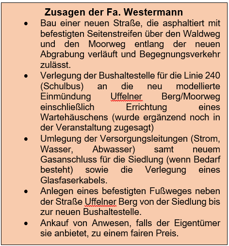 In der Zwischenzeit hat der IVU einige Gespräche zwischen den Anwohnern der Siedlung Uffelner Berg und der Fa. Westermann moderiert und auch eigene Lösungsvorschläge eingebracht. Als Ergebnis hat die Fa. Westermann Ausgleichsmaßnahmen zugesagt. Damit waren die Anwohner sichtlich zufrieden und werden im Gegenzug ihren Widerstand gegen das Abgraben der Straße "Am Wilhelmschacht" aufgegeben. Letzteres war das Ergebnis der letzten Gesprächsrunde unter Moderation des IVU und wird als Voraussetzung für die Zustimmung des Rates der Stadt Ibbenbüren für die Abgrabung der Straße gesehen.