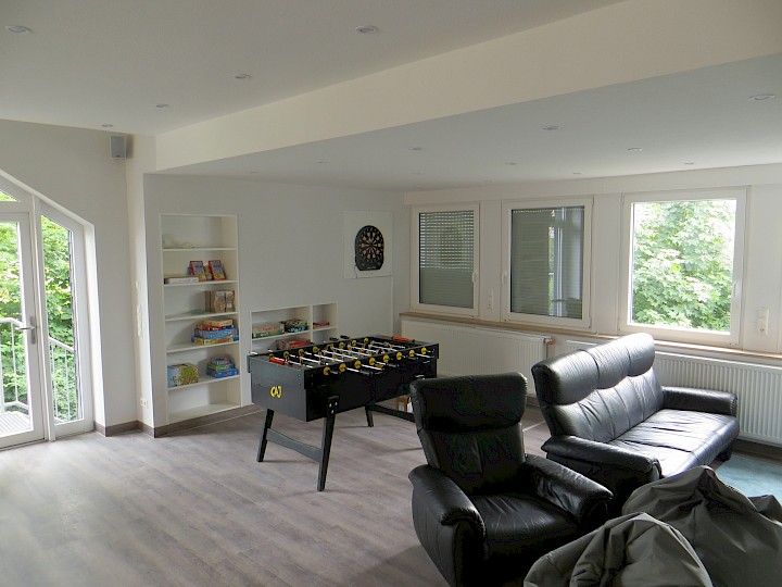 Daneben stehen ein Kicker, ein Dartspiel sowie Bücher und Gesellschaftsspiele den Nutzern zur Verfügung. Eine großzügige Einbauküche mit Kühlschrank, Spülmaschine und Induktions-Herd samt Backofen bieten Möglichkeiten zum Kochen und Backen. Bequeme Sitzmöbel und Tische und Stühle runden die Einrichtung ab.