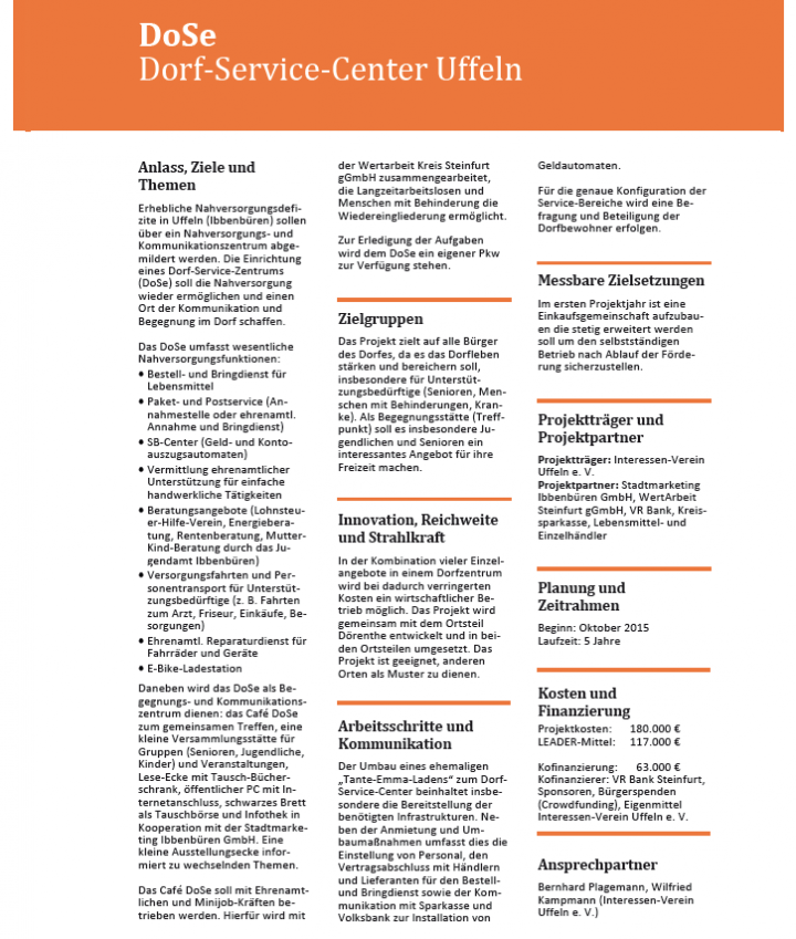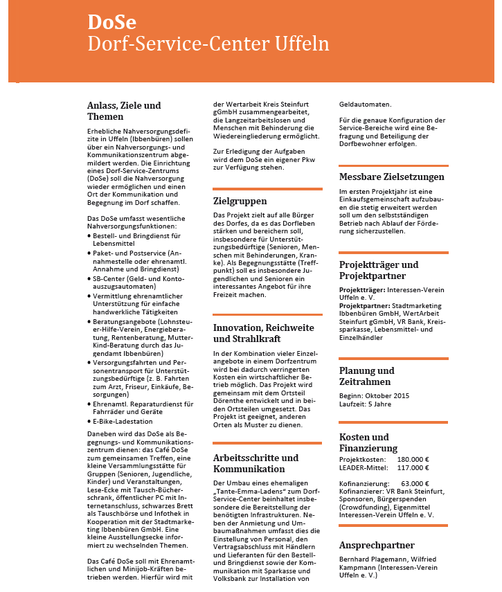 Das Dorf-Service-Center (kurz DoSe) sollte danach eine Vielzahl von Funktionen erfüllen. Das Konzept kam so gut an, dass es als Leitprojekt in die Bewerbung der LAG Tecklenburger Land für die LEADER-Förderung 2014 – 2020 aufgenommen wurde (siehe nebenstehende Abbildung).