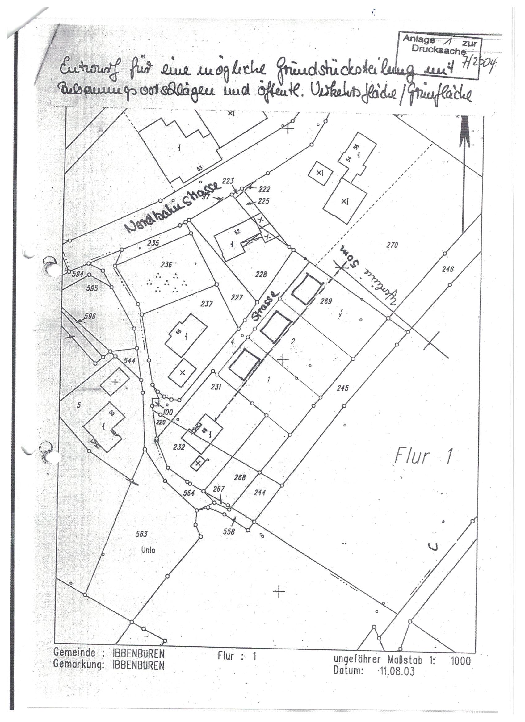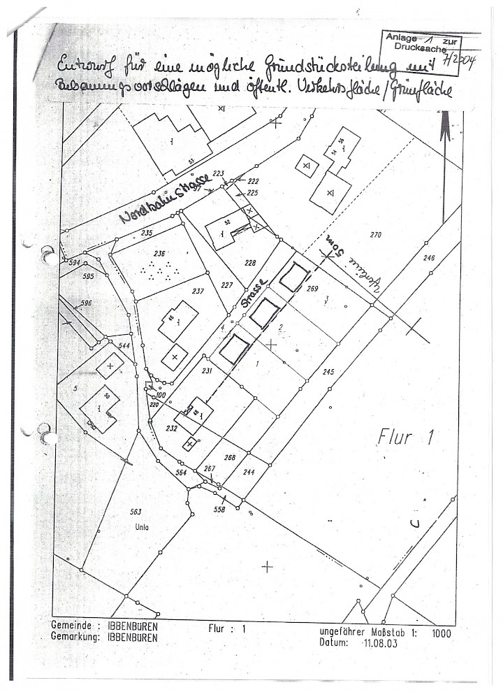 So wurde im Mai 2004 durch den Rat die Ergänzung der Satzung um das städtische Flurstück beschlossen. In dieser Form ist sie heute noch gültig. Der Vorlage war eine Skizze beigefügt, aus der zu entnehmen war, wie das Flurstück für eine Bebauung aufgeteilt werden sollte.