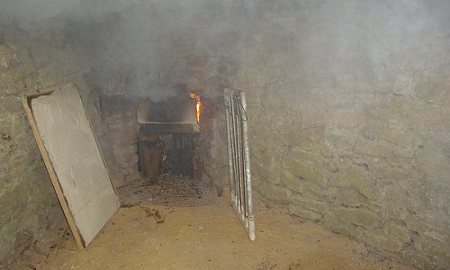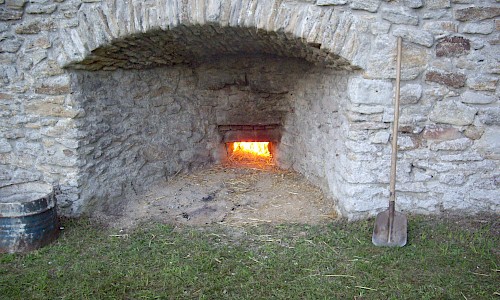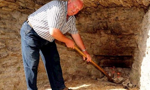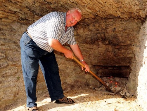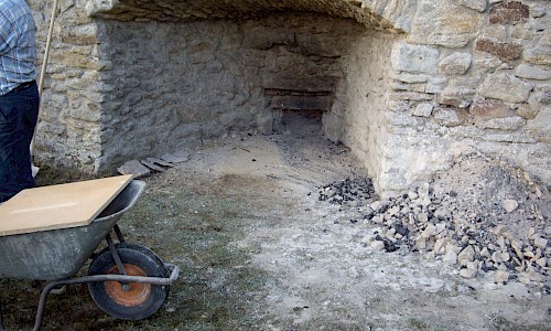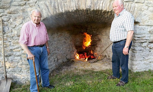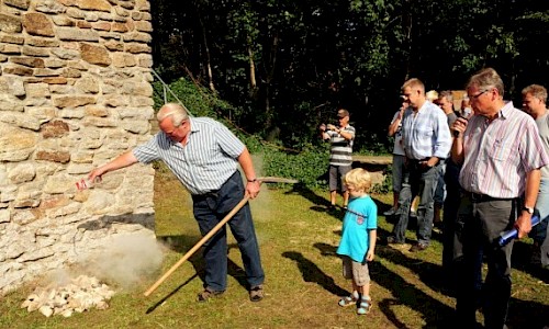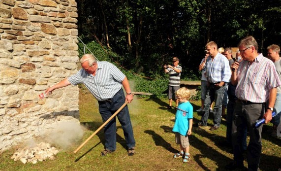 Am Samstagnachmittag stand die Demonstration der Entnahme des gebrannten Kalkes im Vordergrund. „Brennmeister“ Alfons Bäumer, der selbst in jungen Jahren noch aktiv am Kalkofen Tegelmann das Handwerk des Kalkbrennens erlernt hat und Hubert Rekers holten den frisch gebrannten Kalk aus den Ausziehöffnungen.