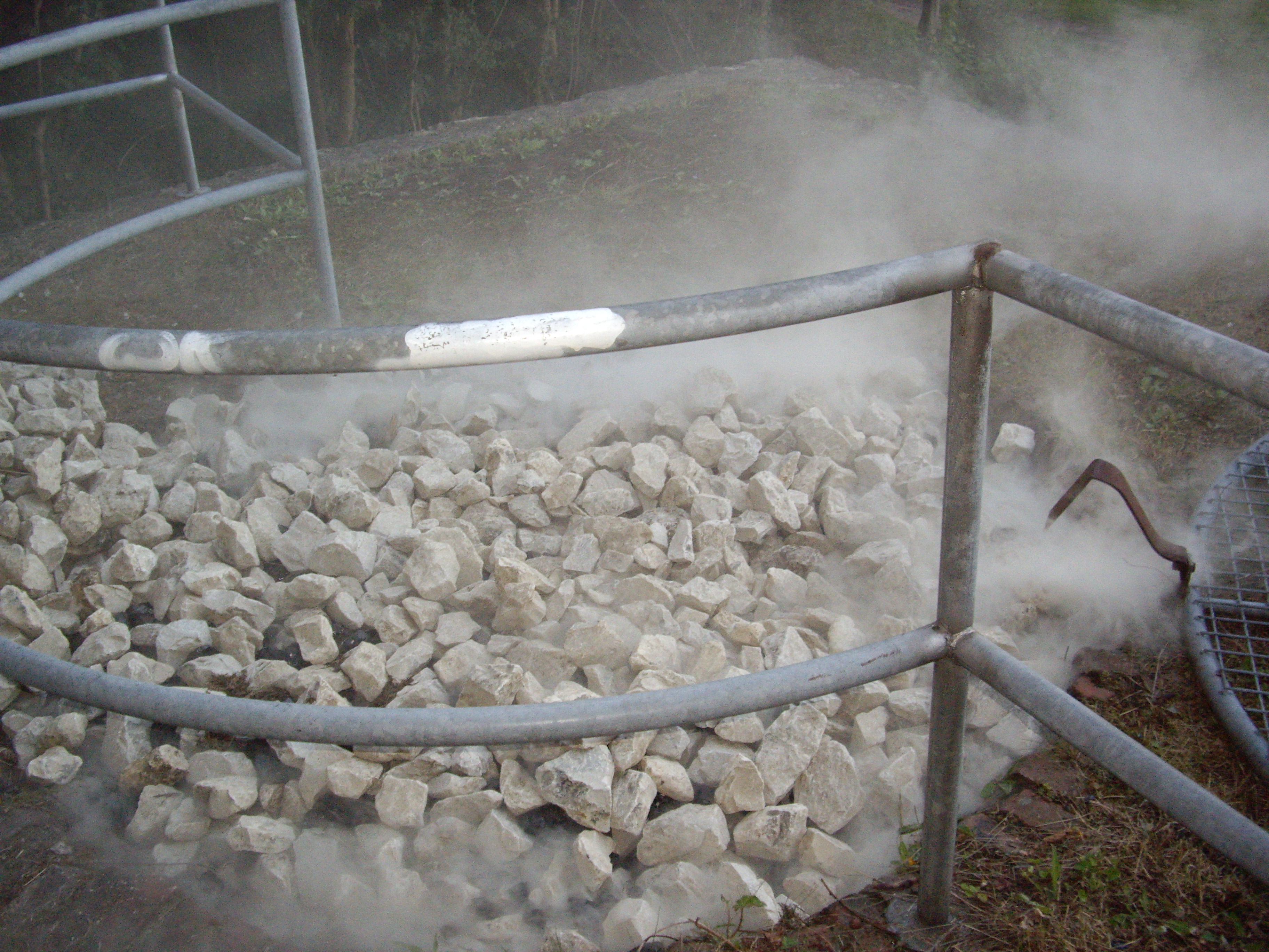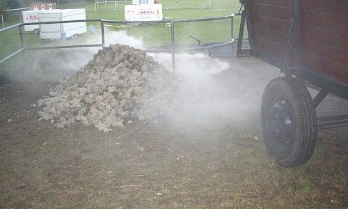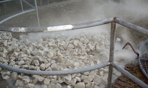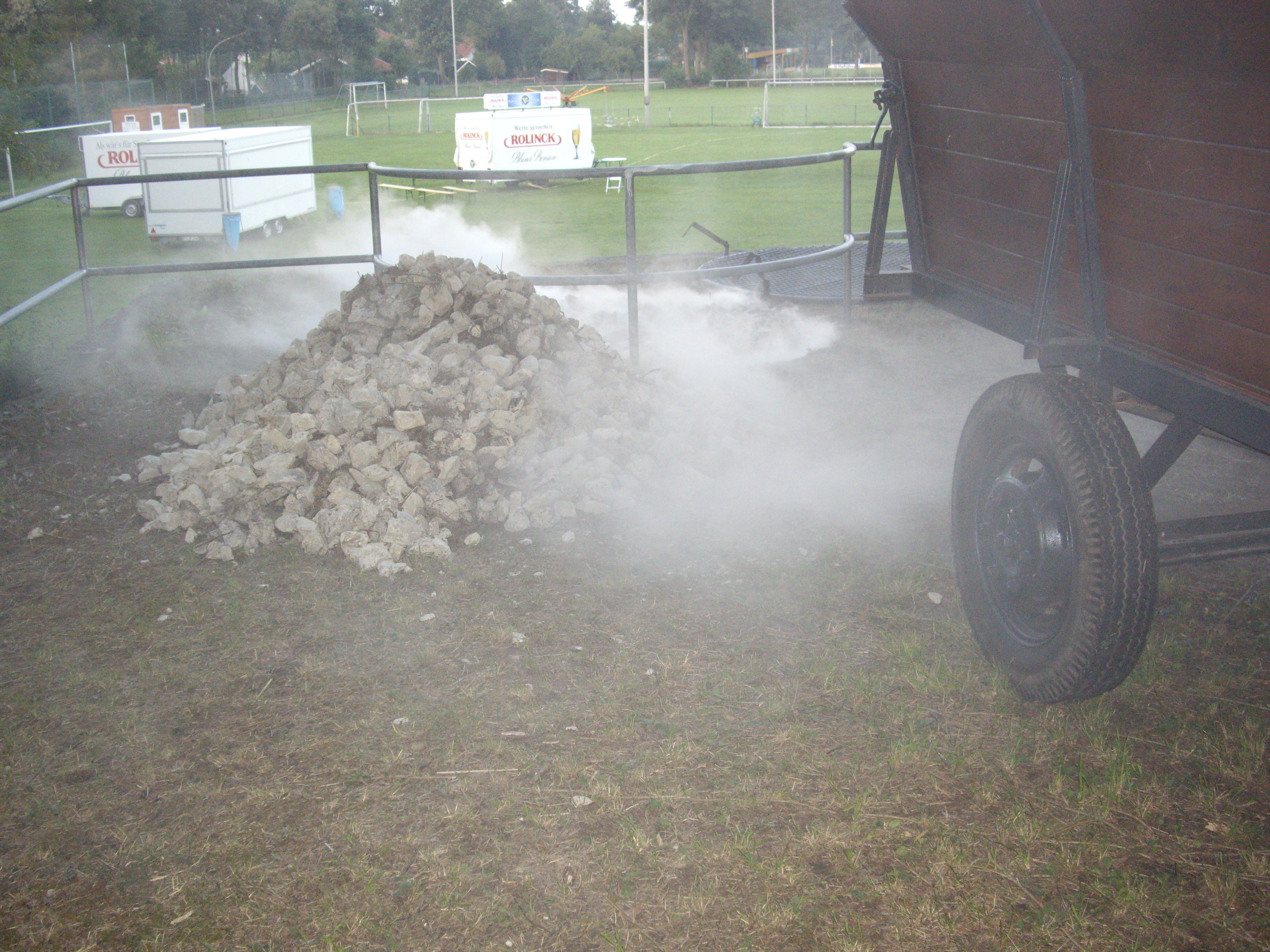 Mit Wasser wurde das Kalkgestein gelöscht und die Steine zerbröselten zu Kalkmehl. Das Zuschauerinteresse war groß und alle waren erstaunt über das gelungene Brennergebnis.