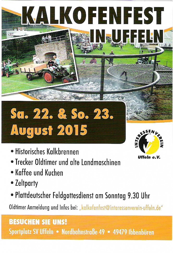 Wie im Jahr 2010 beschlossen, fand auch im Jahr 2015 wieder ein Festwochenende am Kalkofen Wieter-Wennig statt. Der Interessen-Verein lud stellvertretend für alle Uffelner Vereine zum großen Kalkofen-Fest ein.