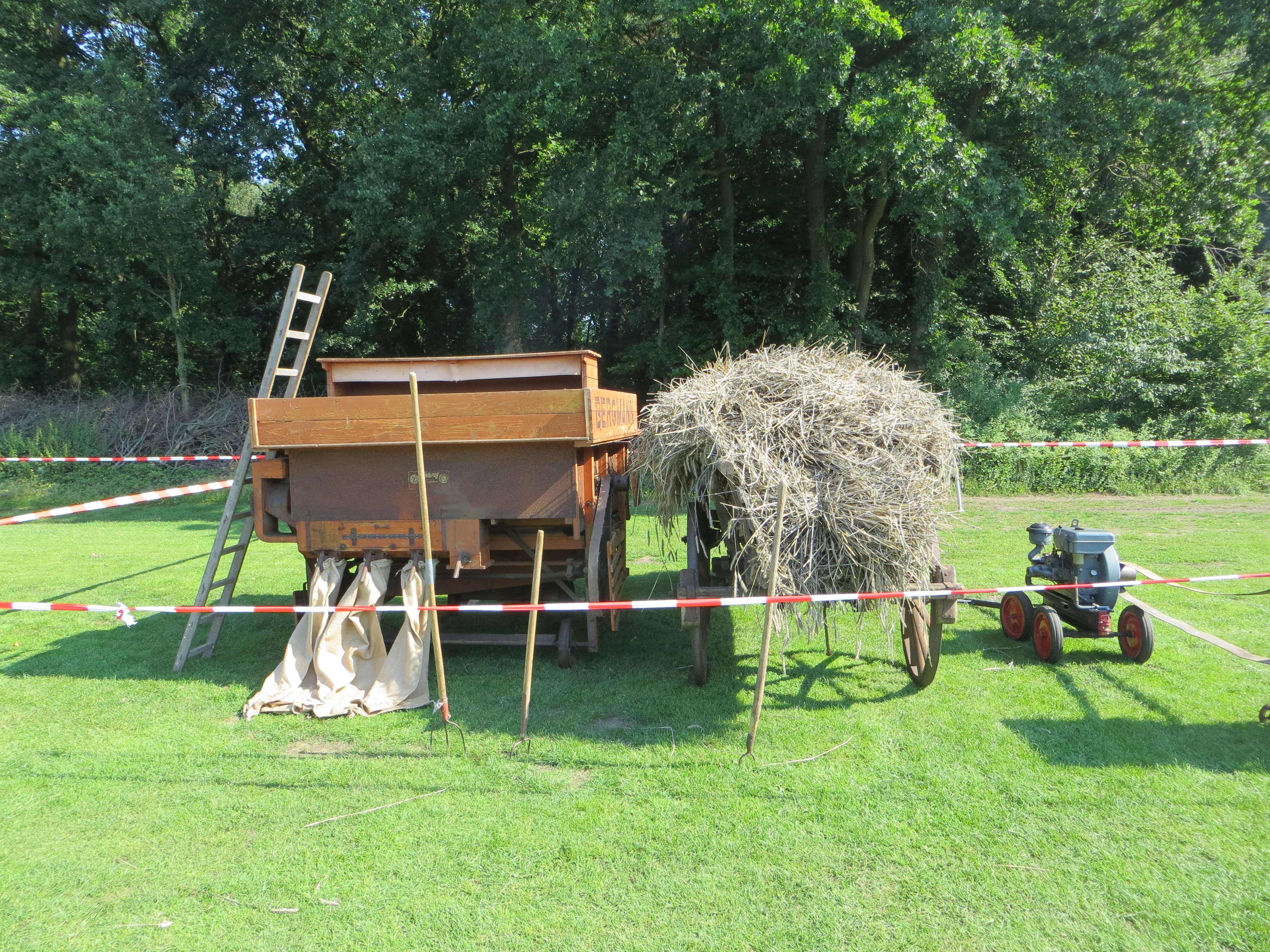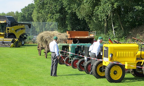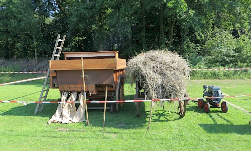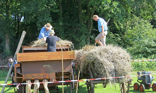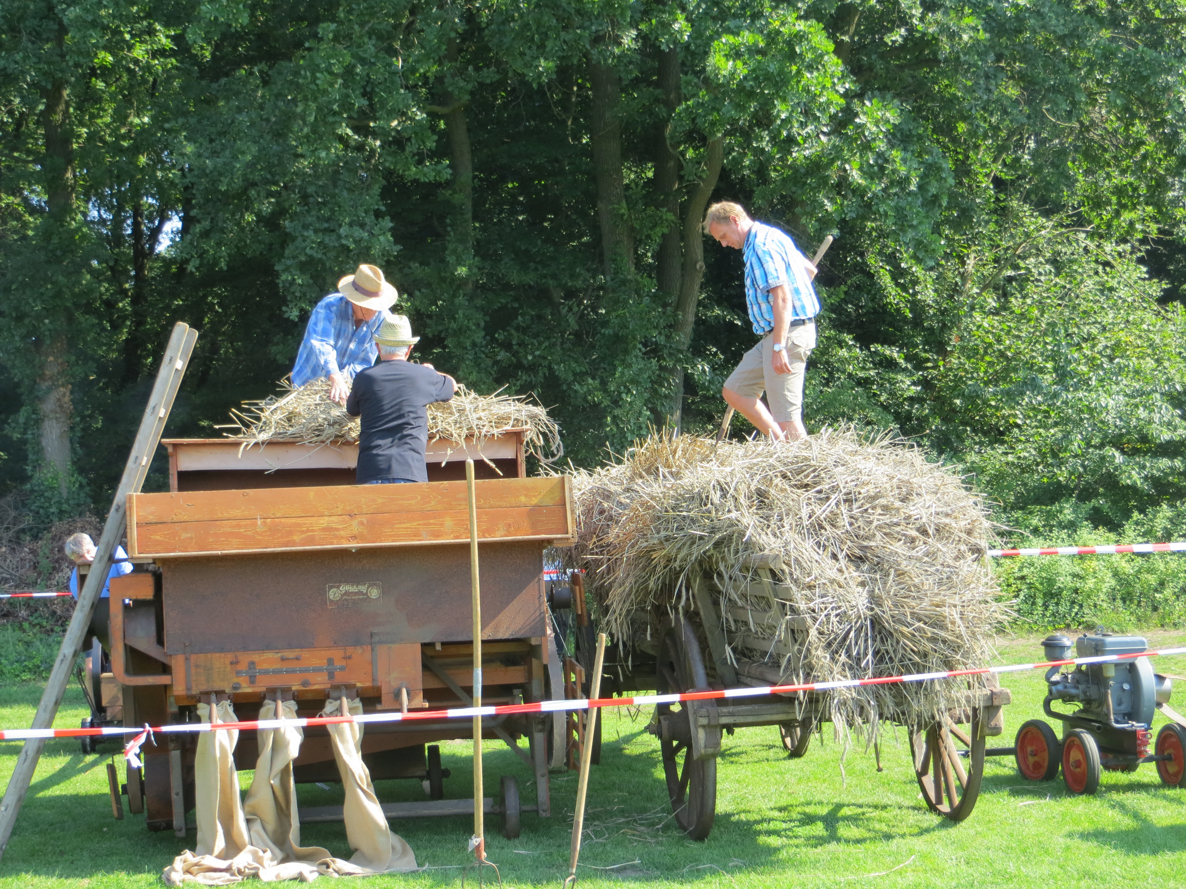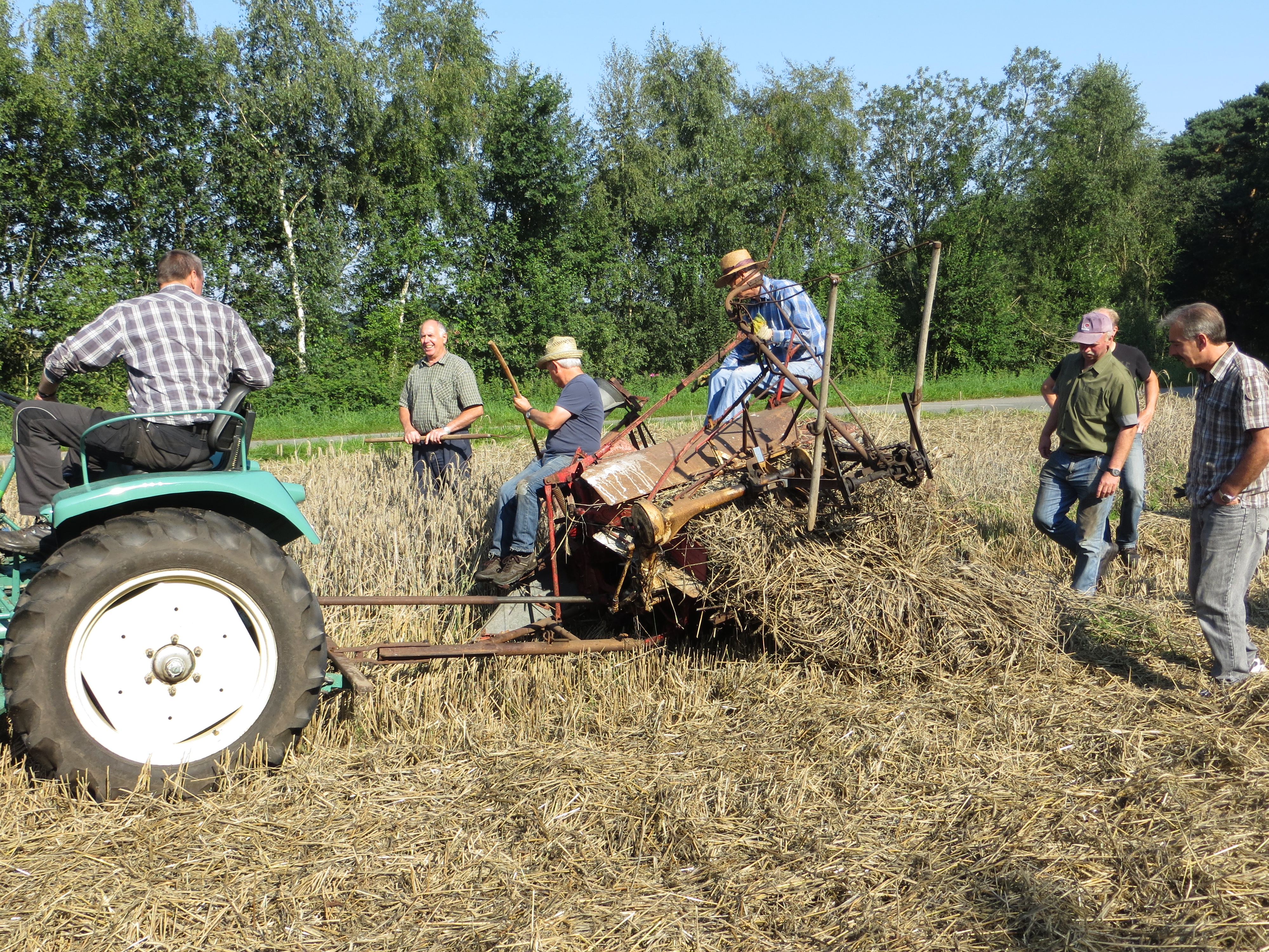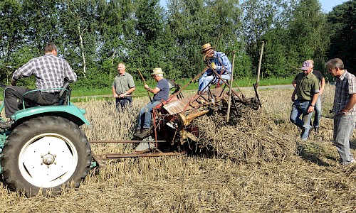 Nachmittags wurde mit einem alten Dreschkasten (Dörsken mit denn Dörsker) Getreide gedroschen und das gewonnene Korn in einer Schrotmühle gemahlen. Zur Ernte des Getreides hatte dank Thomas Schmitz eine Roggenfläche zur Verfügung gestanden, die vorab mit dem Bindermäher gemäht worden war. Am Festtag wurden die Garben dann mit dem Ringstenwagen zum Dreschen eingefahren.