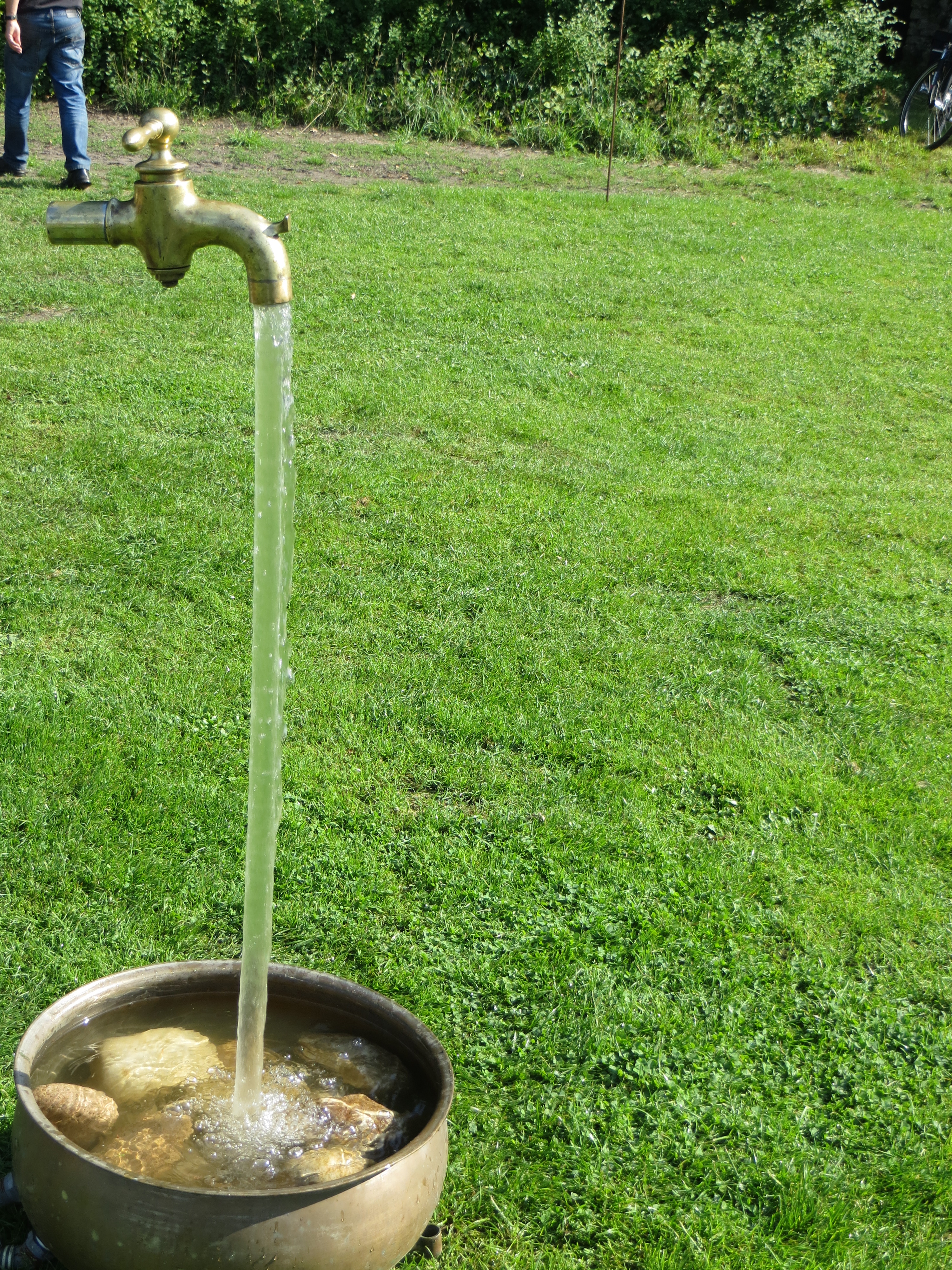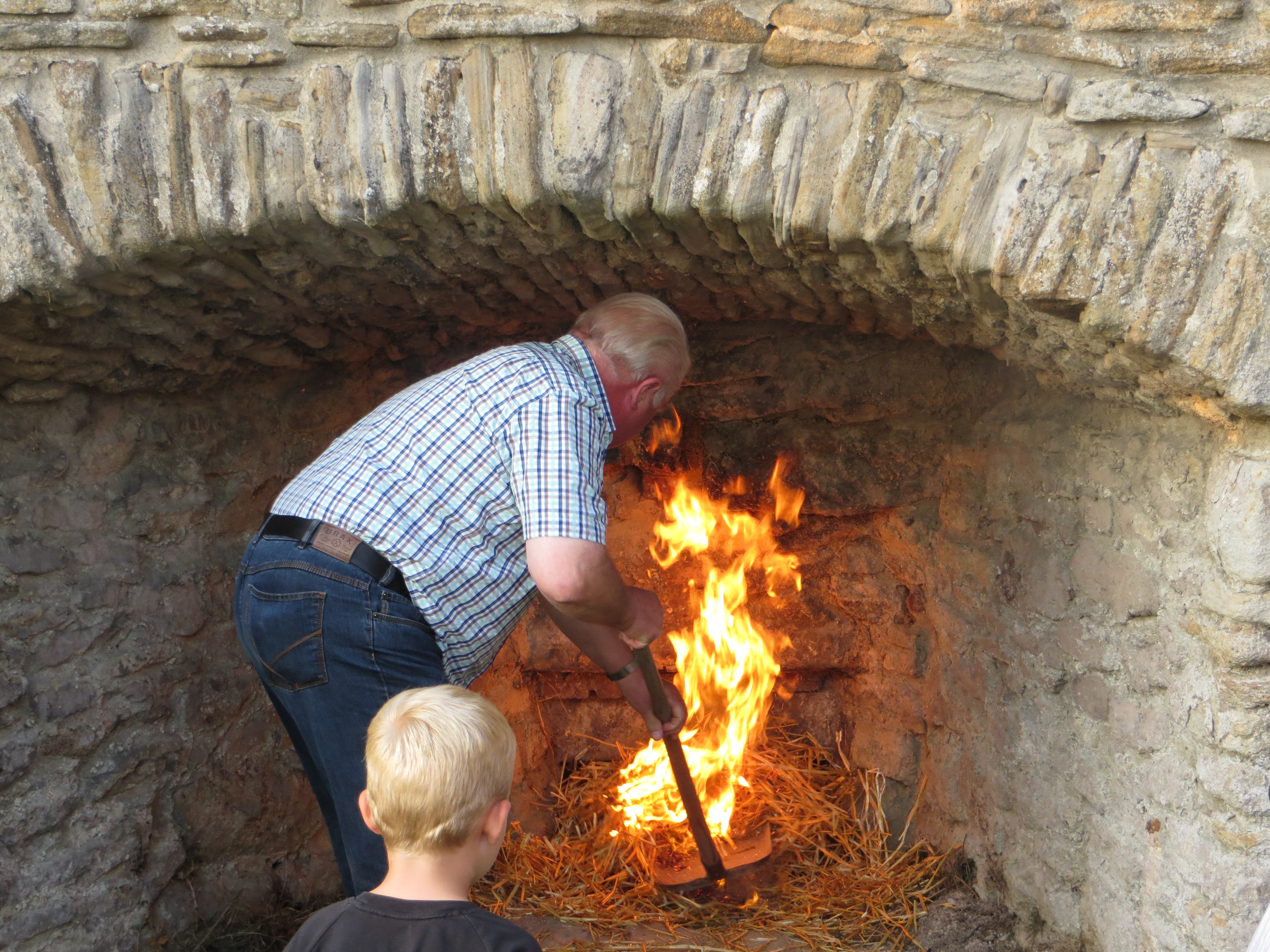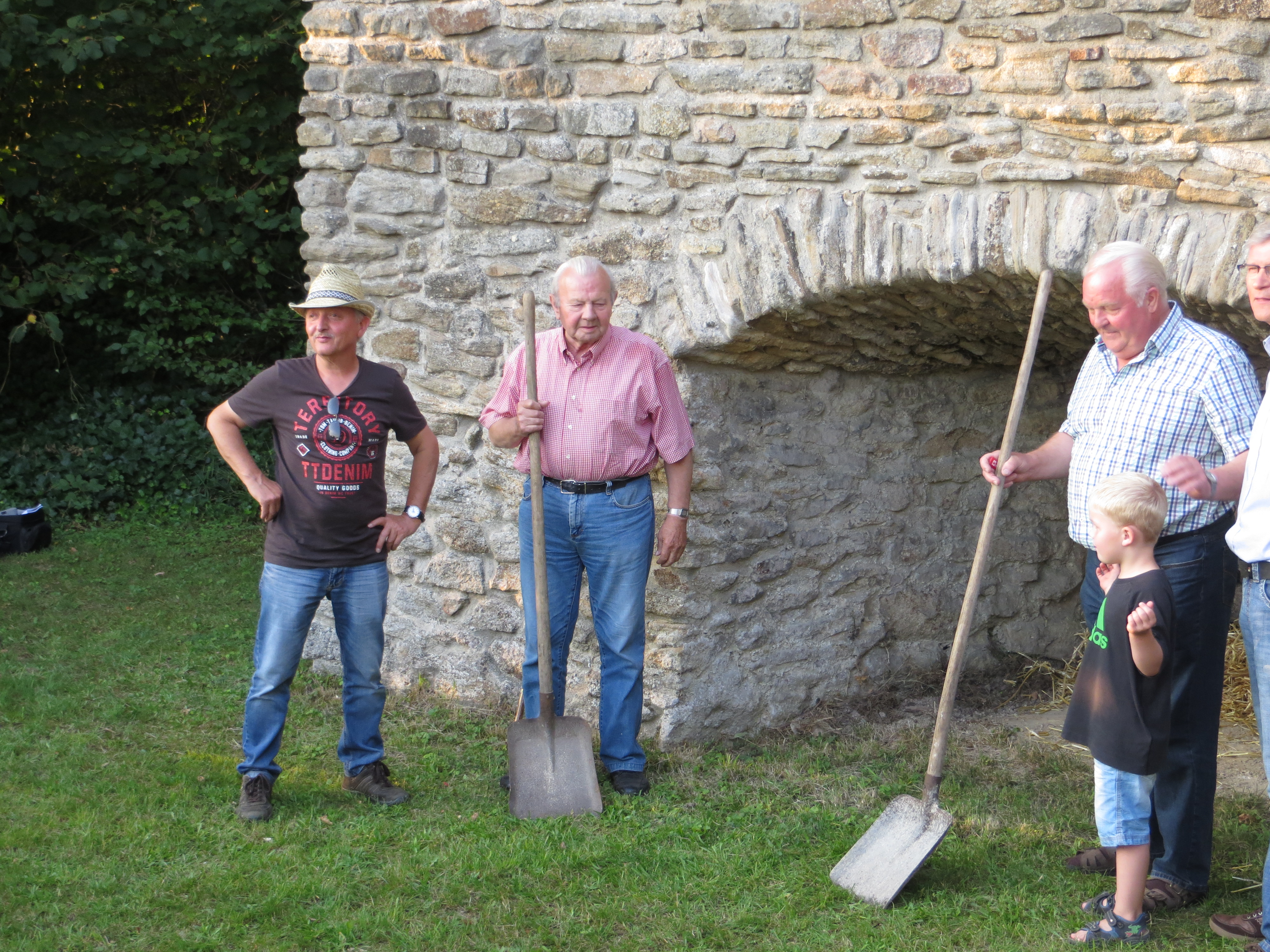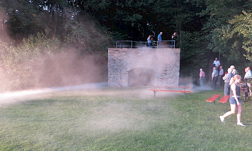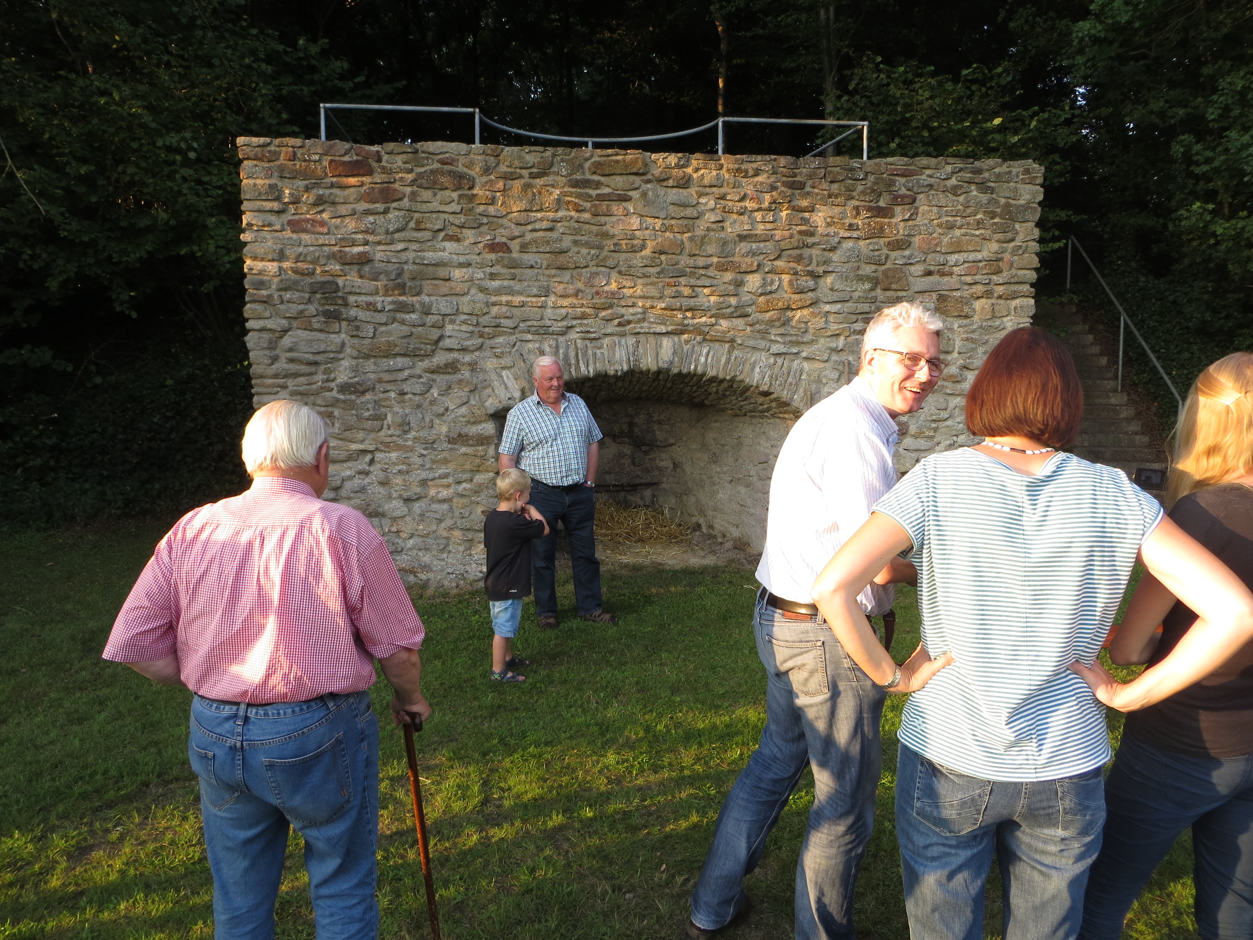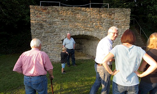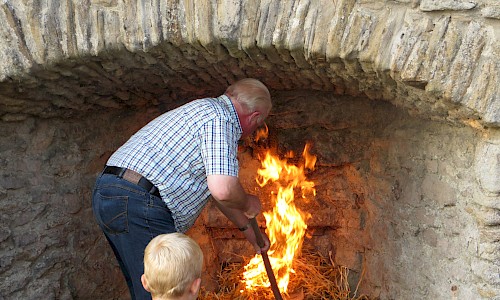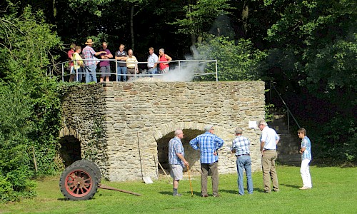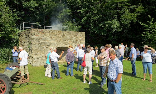 Bernhard Plagemann machte fast stündlich Führungen zur Tradition des Kalkbrennens. Ein Höhepunkt war die dann die Entnahme des gebrannten Kalks aus dem Ofen und das Ablöschen mit Wasser, was auf reges Zuschauerinteresse stieß.