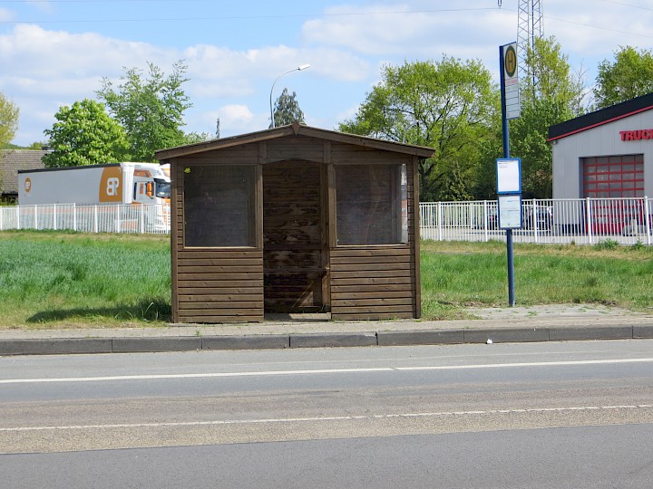 So erwarb der Interessen-Verein für 300 € einen Holz-Marktstand in einem Baumarkt und funktionierte diesen zu einem Wartehäuschen um. Die Hütte wurde auf ein Betonfundament gesetzt und die Fensteröffnungen mit Acrylglas verschlossen. Seit 2014 leistet gute Dienste. Sie schützt aber nicht nur Fahrschüler. Da die Hütte allseits geschlossen ist, wird sie auch gerne von Radfahrern und Obdachlosen als Wetterschutzhütte genutzt.