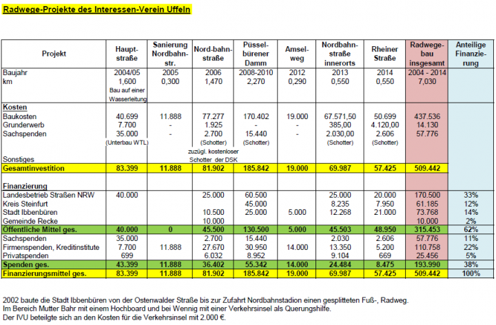 Vor Gründung des Interessen-Vereins Uffeln hatte bereits der Sportverein im Jahr 2000 in einer Bürgerversammlung mit dem Landesbetrieb Straßen NRW, dem Kreis Steinfurt und der Stadt Ibbenbüren auf diese Missstände hingewiesen. Den zahlreich anwesenden Uffelner Bürgern wurde signalisiert, dass in naher Zukunft aufgrund leerer öffentlicher Haushaltskassen der Bau eines Radweges nicht zu verwirklichen sei. Ein Hauptanliegen des IVU bei Gründung war, nach Möglichkeiten zu suchen, wie trotzdem Radwege in Uffeln zu verwirklichen sind.