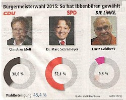 Am 13.9.2015 sollte in Ibbenbüren ein neuer Bürgermeister gewählt werden. Heinz Steingröver wollte aus dem Amt ausscheiden und drei Kandidaten bewarben sich um seine Nachfolge: Ernst Goldbeck –DIE LINKE-, Christian Moll –CDU- und Dr. Marc Schrameyer –SPD- stellten sich den Wählerinnen und Wählern.