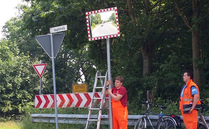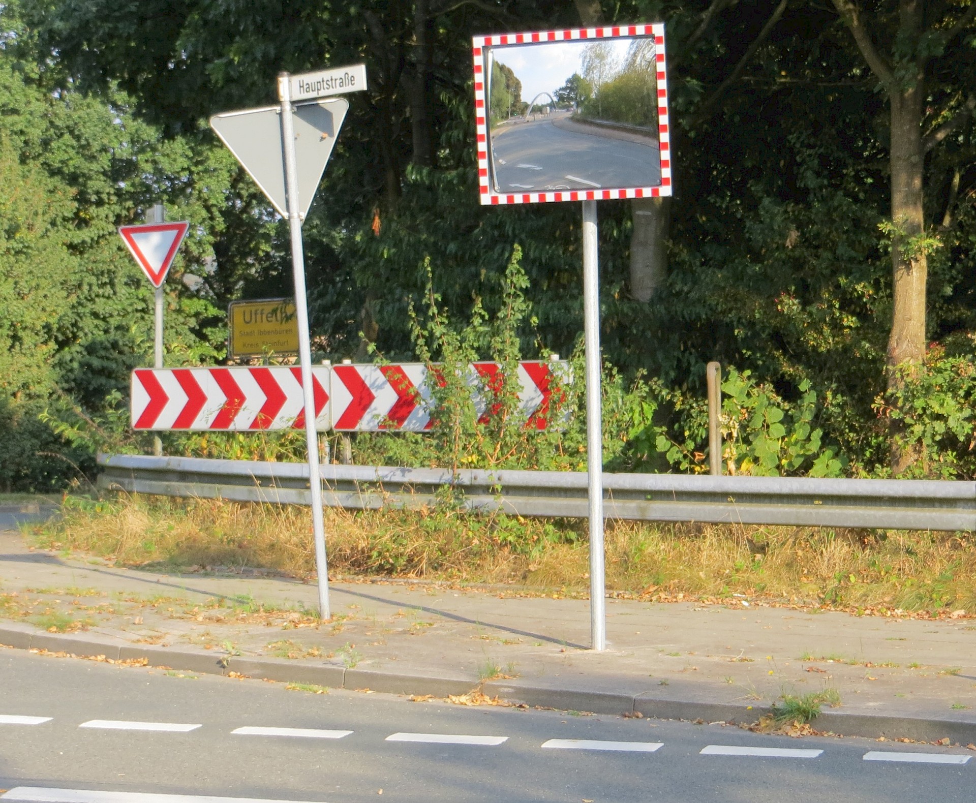 Gerade die Uffelner Senioren hatten schon häufig darauf hingewiesen, dass die Überquerung der Hauptstr. in Höhe der Kanalbrücke in Richtung Uffeln Mitte für Radfahrer und Fußgänger sehr gefährlich ist. Wegen des Kurvenverlaufs ist die Sicht sehr begrenzt. Sie forderten daher einen Verkehrsspiegel als Querungshilfe. Auch bei der letzten Mitgliederversammlung des IVU im Jahr 2016 war dies wieder Thema. Gespräche des IVU mit der Stadt und dem Landesbetrieb Straßen NRW, es handelt sich bei der Hauptstraße ja um eine Landstraße, führten dazu, dass sich die gemeinsame Verkehrskommission endlich mit der Angelegenheit befasste und er Aufstellung eines Spiegels als Querungshilfe zustimmte, falls der Spiegel geeignet sei, das Problem zu lösen.
